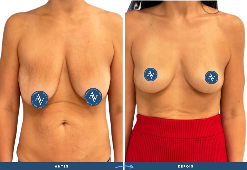 O resultado são mamas levantadas e firmes. O volume fica concentrado na parte inferior. A cirurgia remove o excesso de pele e eleva o tecido mamário.